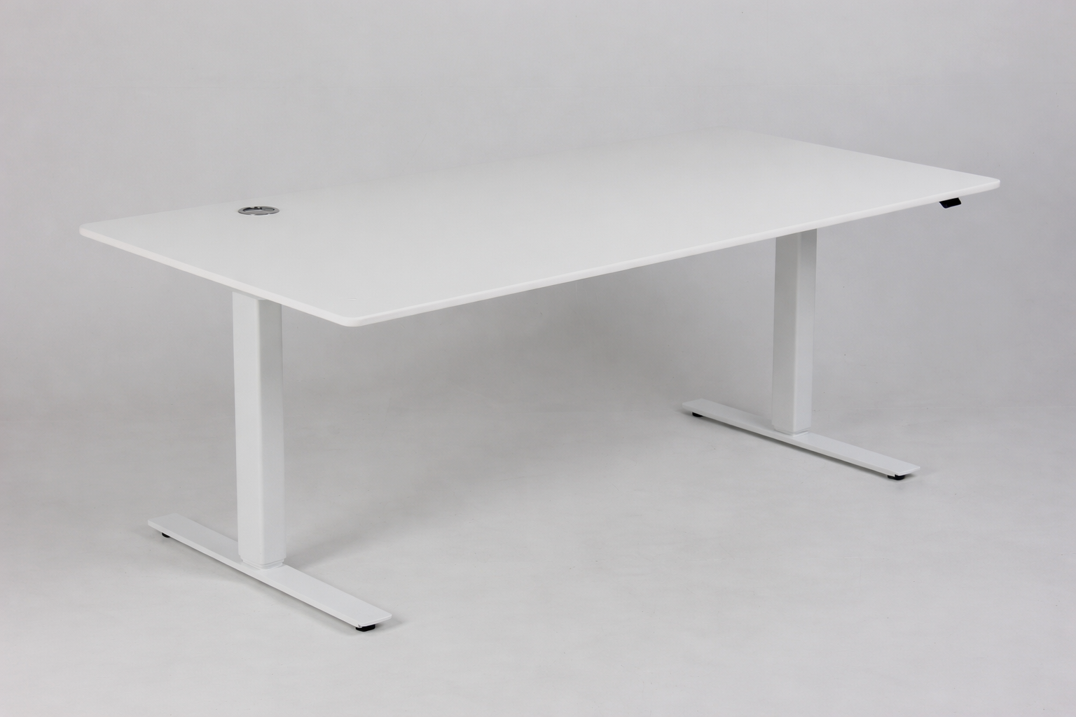 "Swedstyle elektrisk hæve sænkebord med hvid laminatbordplade med afrundede kanter og hjørner. 3-leddet hvidt stel med 2 motorer, som giver en stabil højdejustering, selv når stellet er hævet maksimalt.