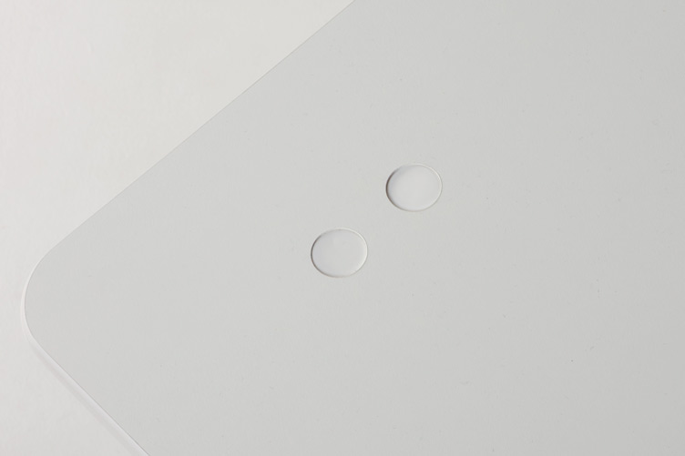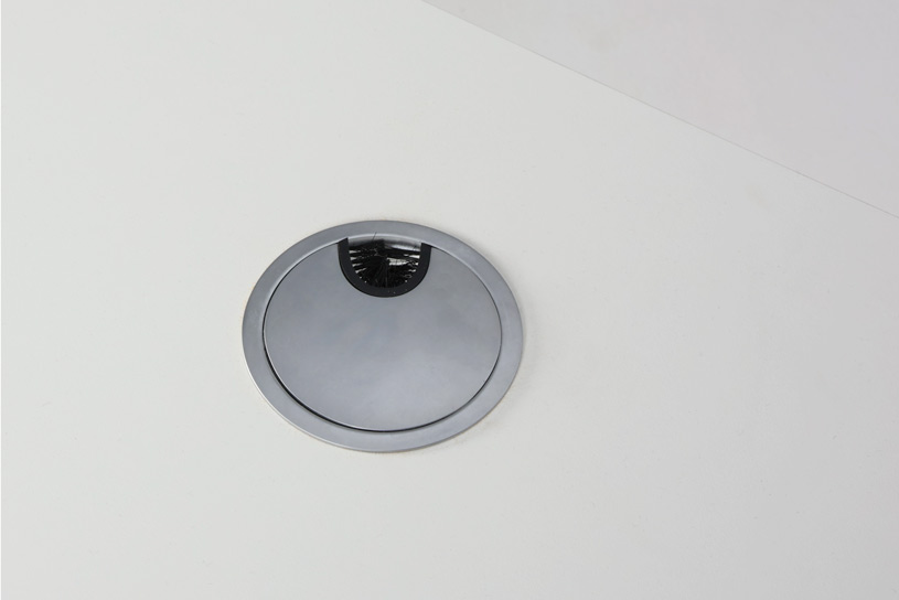 Bemærk: Bordpladen er produceret til integreret styring og er derfor forsynet med to huller i det ene hjørne, lukket med plastpropper. Desuden er forboret et hul til kabelgennemføring i venstre side. Kabelrosetten kan hvis ønsket, i stedet erstattes af en hvid (påfør dette i kommentarfeltet.)