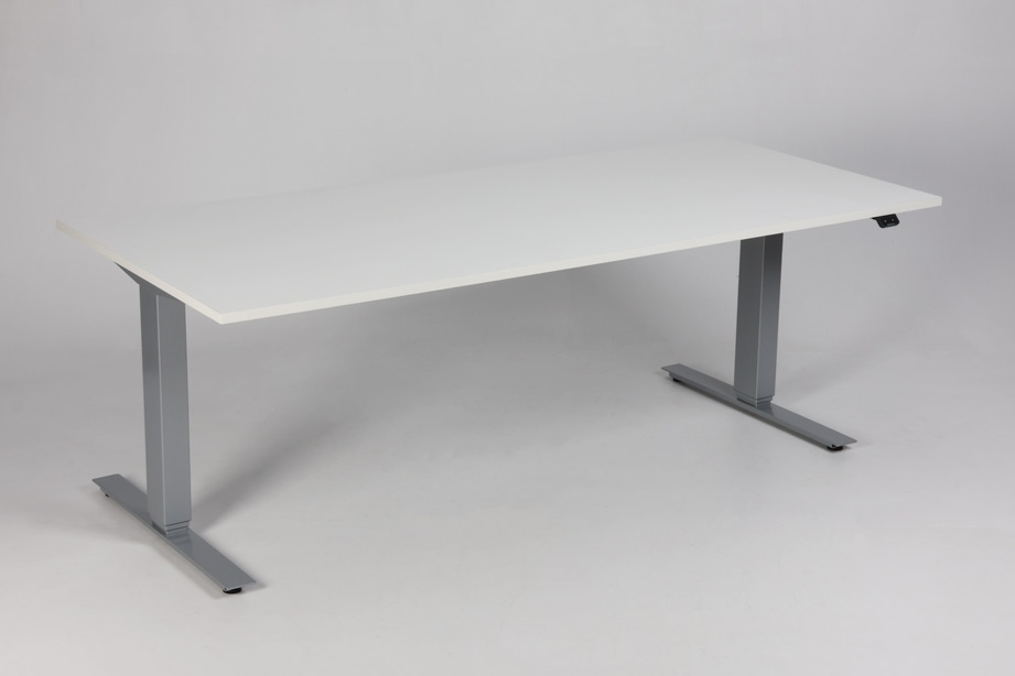 "Swedstyle elektrisk hæve sænkebord med hvid Fumac laminatbordplade med ABS-kant. 3-leddet lysegråt stel med 2 motorer, som giver mulighed for at justere arbejdshøjden efter behov.