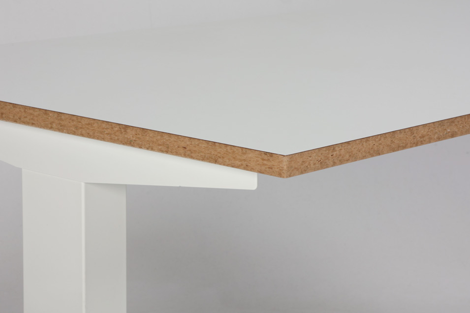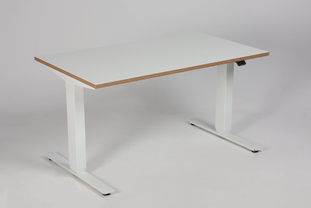 "Swedstyle elektrisk hæve sænkebord med hvid laminatbordplade med lakeret MDF-kant. 3-leddet hvidt stel med 2 motorer, som giver mulighed for at justere arbejdshøjden efter behov.