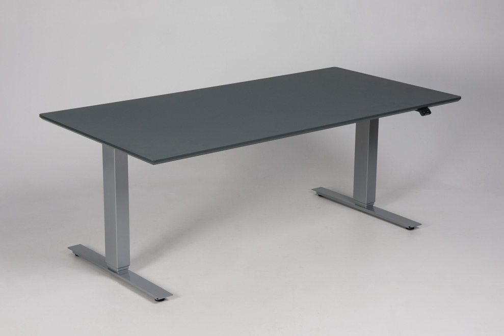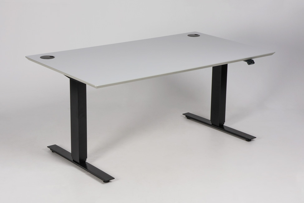 Swedstyle elektrisk hæve sænkebord med Dencon laminatbordplade i lys grå med kabelgennemføring i hvert hjørne. 3-leddet sort stel med 2 motorer, som giver mulighed for at justere arbejdshøjden efter behov.
