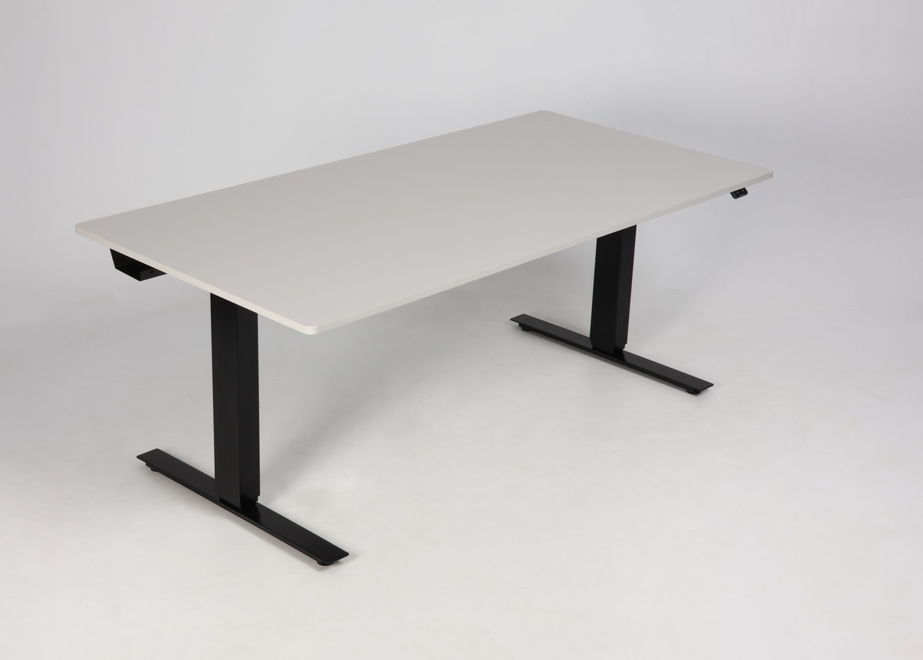 "Fabriksnyt elektrisk hæve-sænkebord med lys grå linoleumsbordplade og sort kvalitetsstel.
