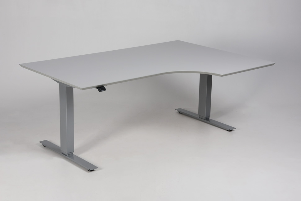 "Swedstyle elektrisk hæve sænkebord med højrevendt Fumac bordplade i lysegrå laminat med affaset kant. 3-leddet gråt stel med 2 motorer, som giver mulighed for at justere arbejdshøjden efter behov.