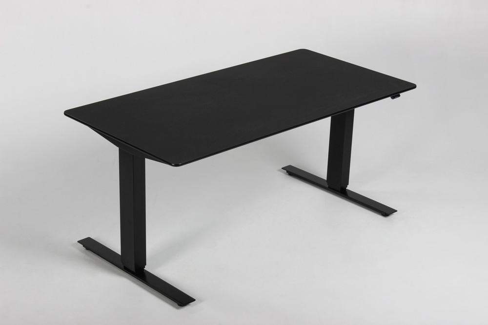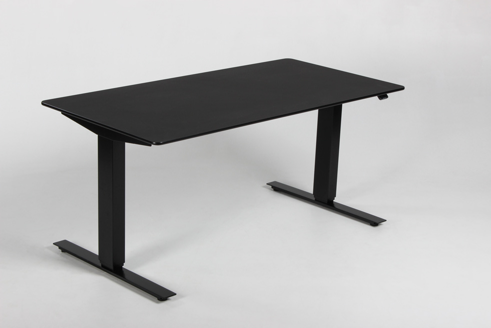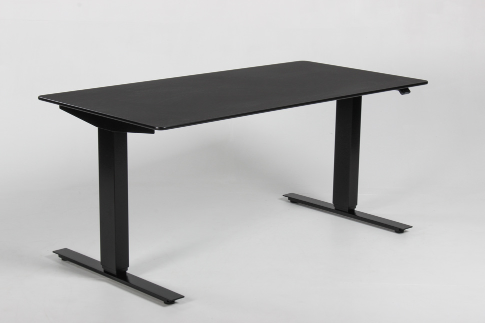 "Fabriksnyt elektrisk hæve-sænkebord med sortmalet MDF bordplade med afrundede hjørner.