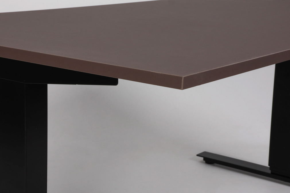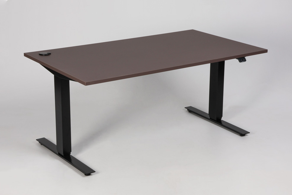 "Swedstyle elektrisk hæve sænkebord med bordplade i støvet brun med lige kant. 3-leddet sort stel med 2 motorer, som giver mulighed for at justere arbejdshøjden efter behov.
