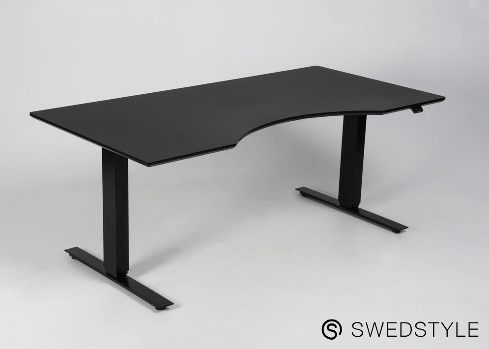 "Swedstyle Thor hæve sænkebord med centreret mavebue, bestående af sort 160 x 90/75 cm linoleumsbordplade og sort 3-leddet stel.