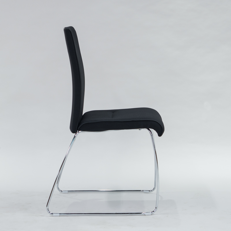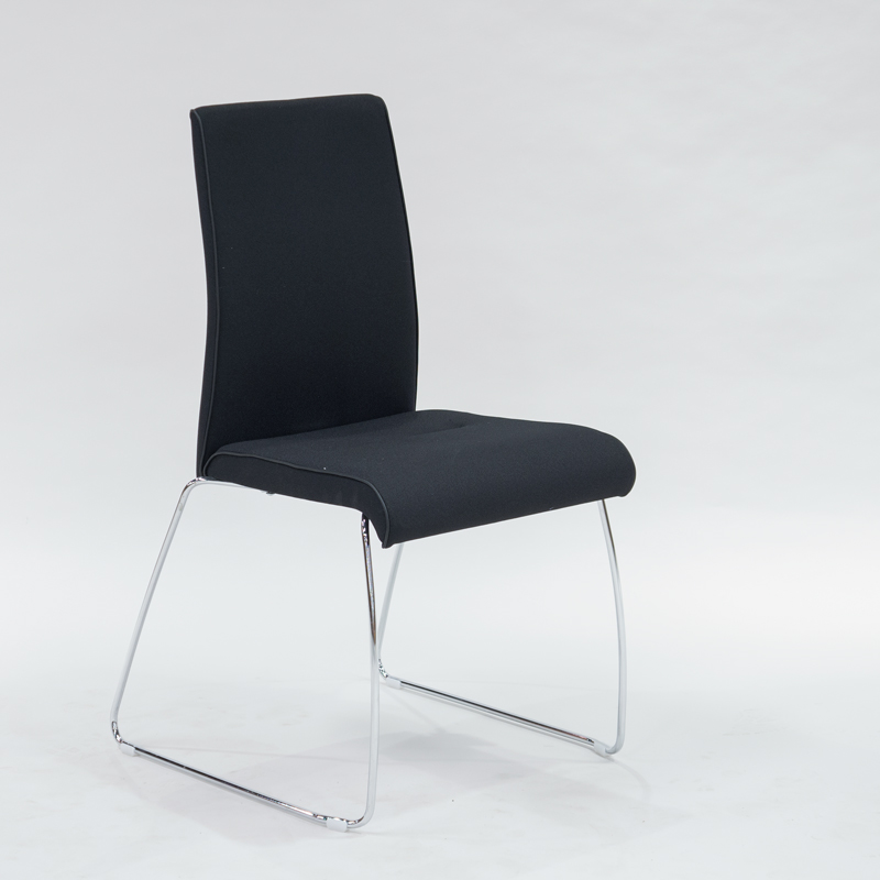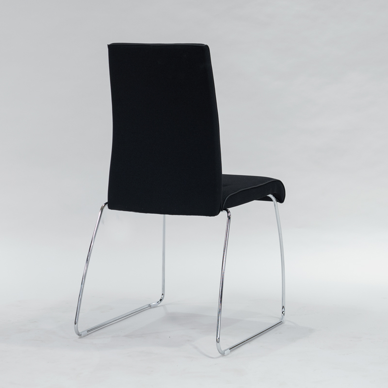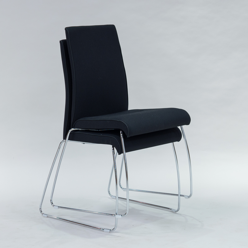 "Tronhill Torus polstret i ryg og sæde med sort møbeltekstil og med blankforkromet medestel. Med sin stabelbare udformning, er den et praktisk og pladsbesparende møbel, der med sit enkle design passer ind i de fleste indretninger og virksomheder.