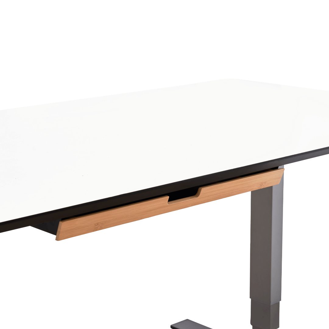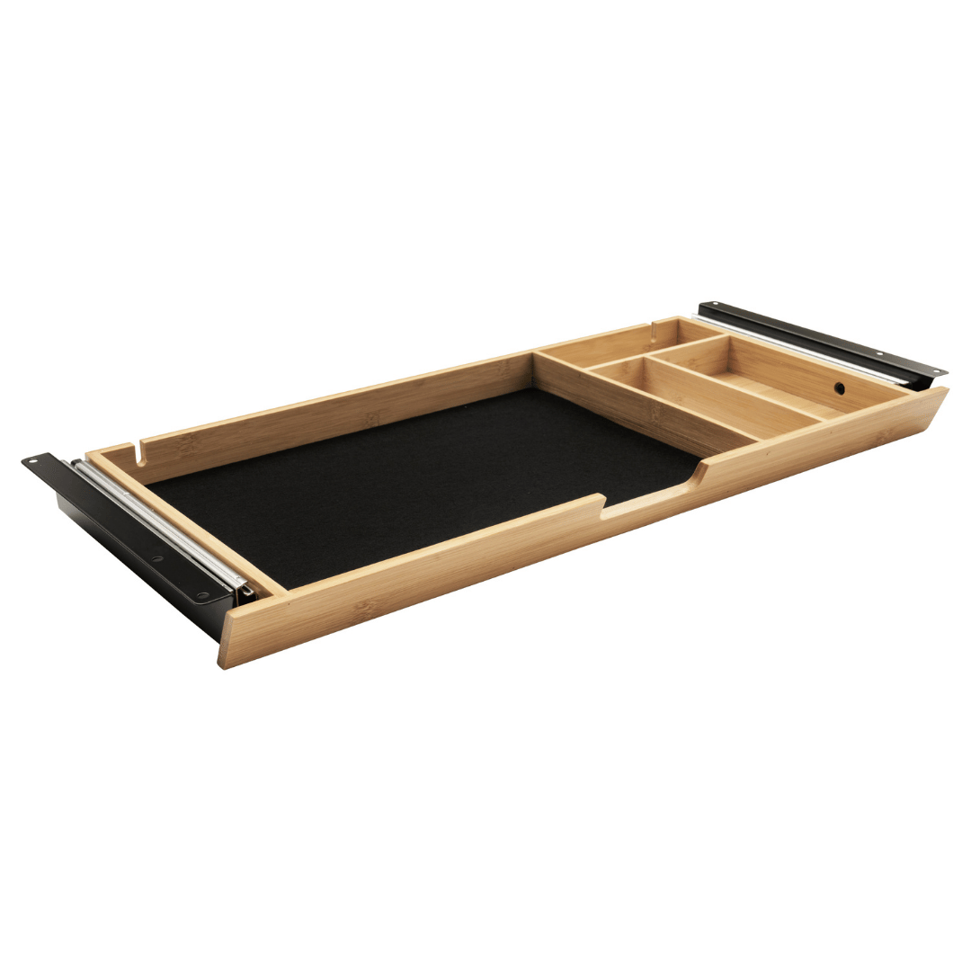 Udtræksskuffe til montering under bordpladen på skrive- eller hæve-sænkebordet, til opbevaring af post-its, kuglepenne og andre kontorartikler – et smart alternativ til den traditionelle penneholder. I designet er der taget højde for kabler og ledninger, som diskret kan skjules ved brugen af de to huller i bagkanten.