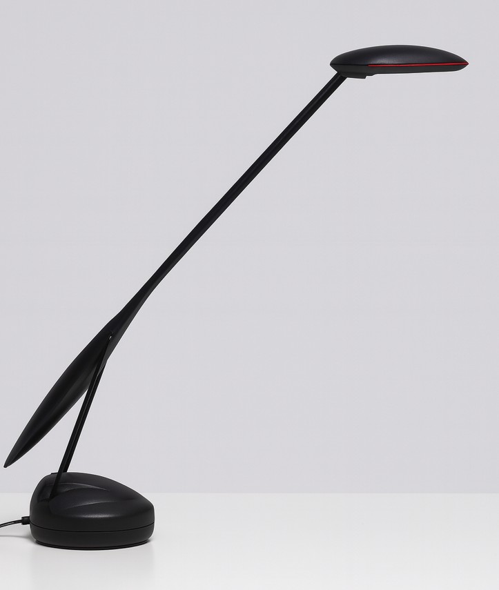 "Unilux Allegro 2080 bordlampe i sort plast med to lysstyrker. Lampen måler ca. 70 cm i højden og har justerbart lampehoved og -arm.