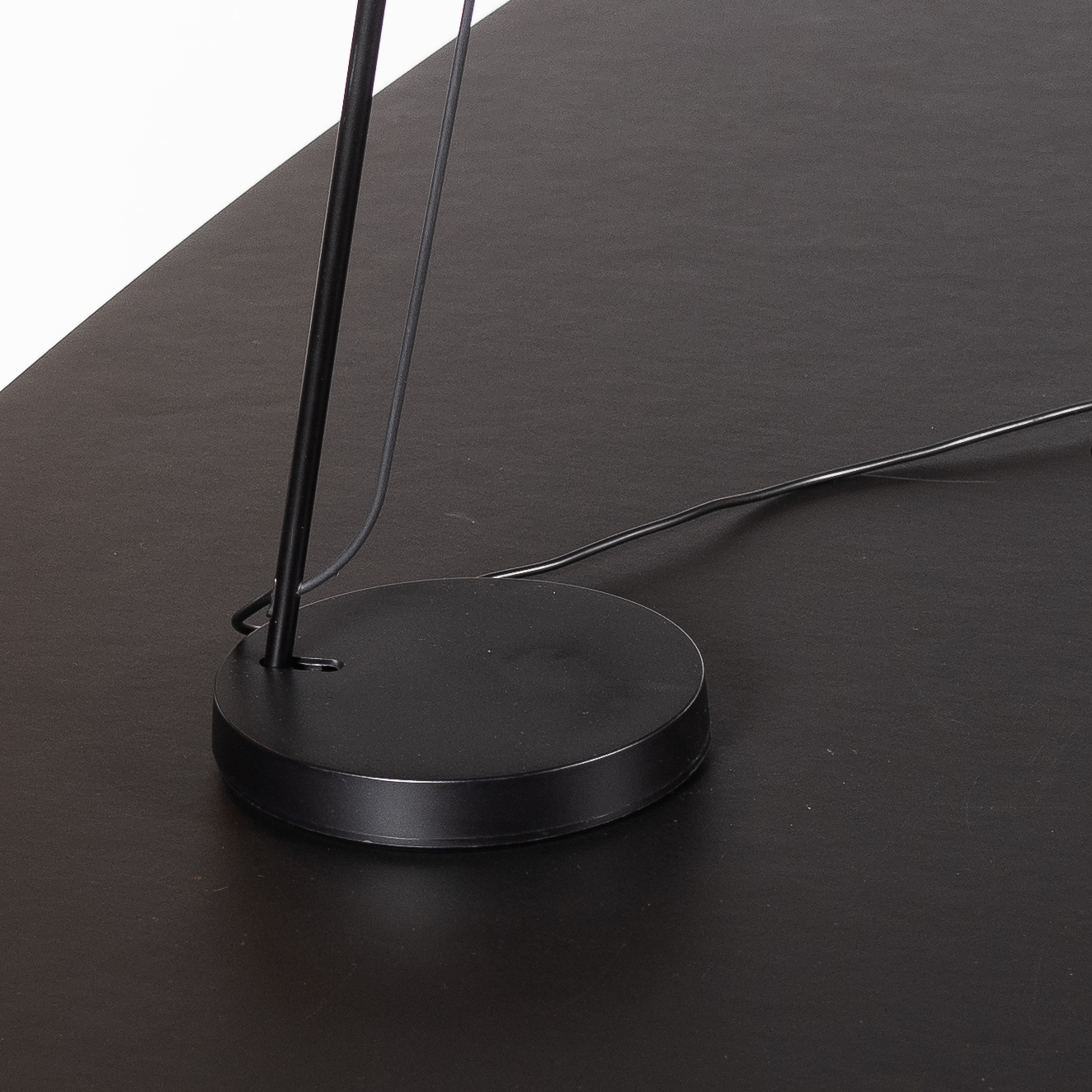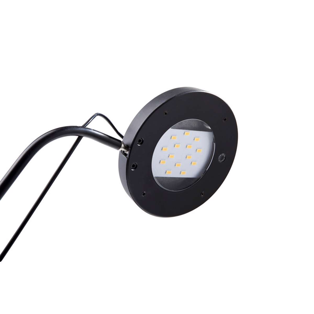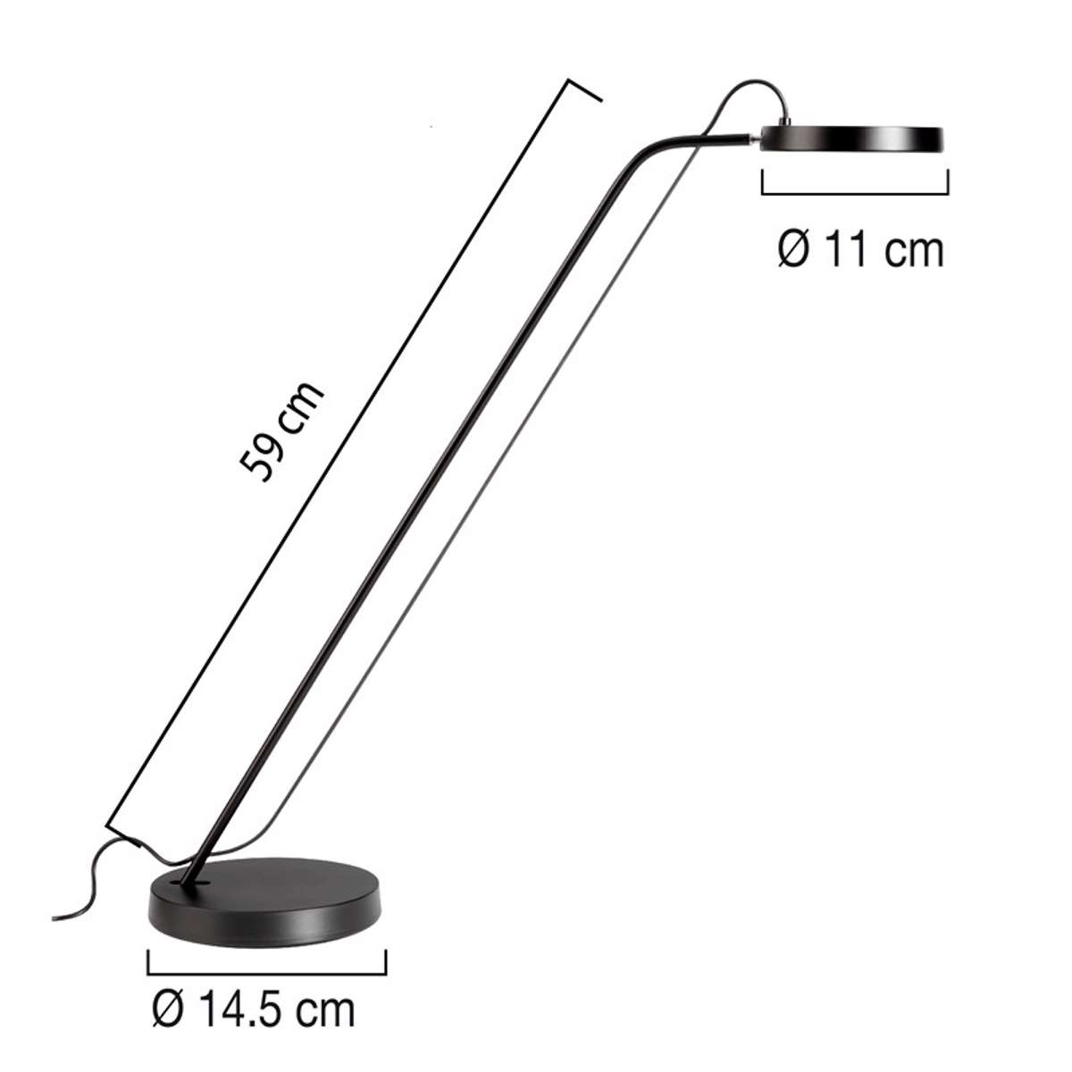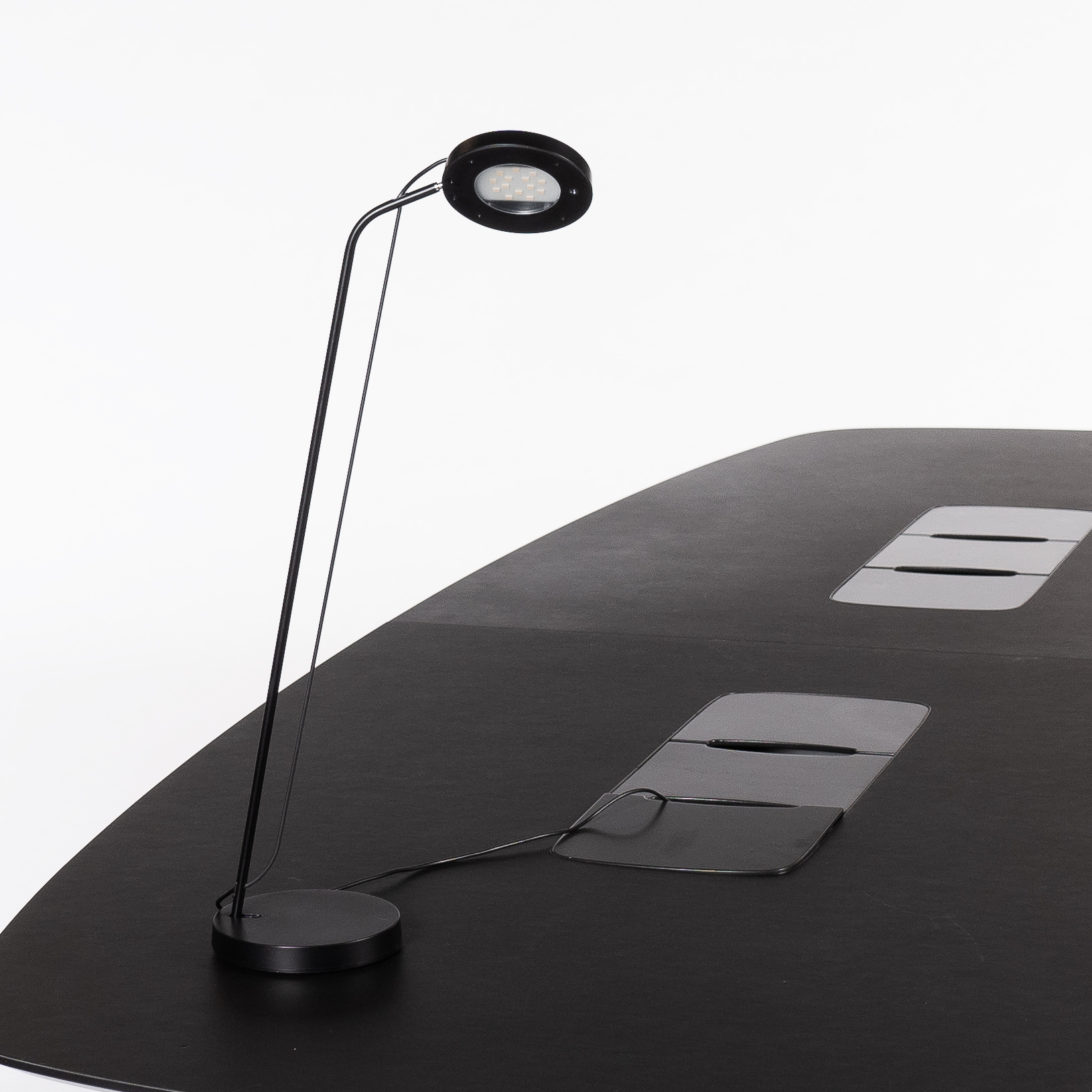 "Sort Unilux Illusio skrivebordslampe med rund fod og rundt hoved. Lampen har asymmetrisk LED-lys.