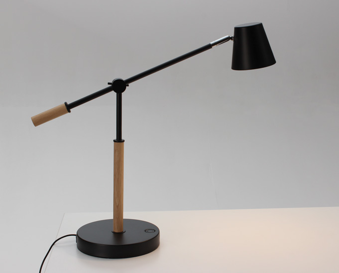 "Unilux Vicky i sort med egefinerede detaljer. Energieffektiv LED-belysning og tre justerbare lysintensiteter og farvetemperaturer for en tilpasset, optimal belysning. Lampefoden har USB-port til opladning af smartphones eller højttalere.