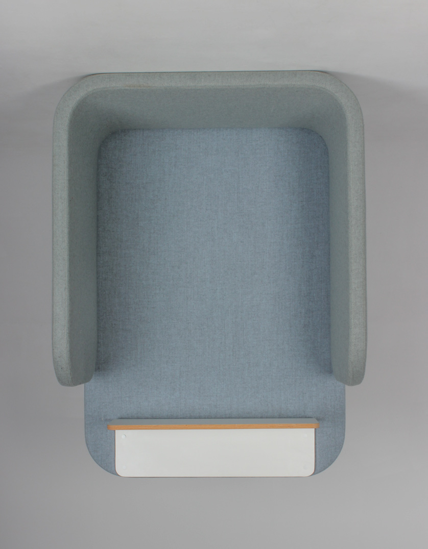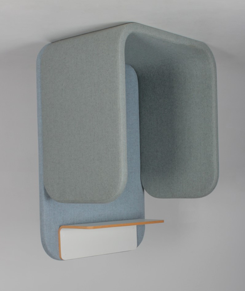 "Væghængt telefonboks med kraftige lydabsoberende vægge og hvid hylde med krydsfinerskant. Akustik-møblet er perfekt til eksempelvis det åbne kontorlandskab, hvor støjgener kan være dominerende. Kombinér evt. med en barstol.