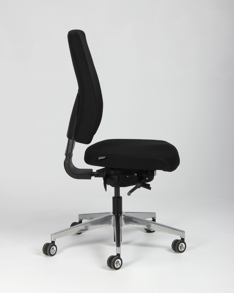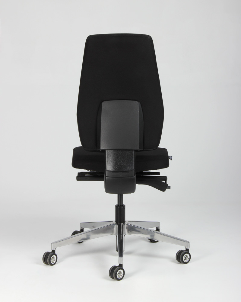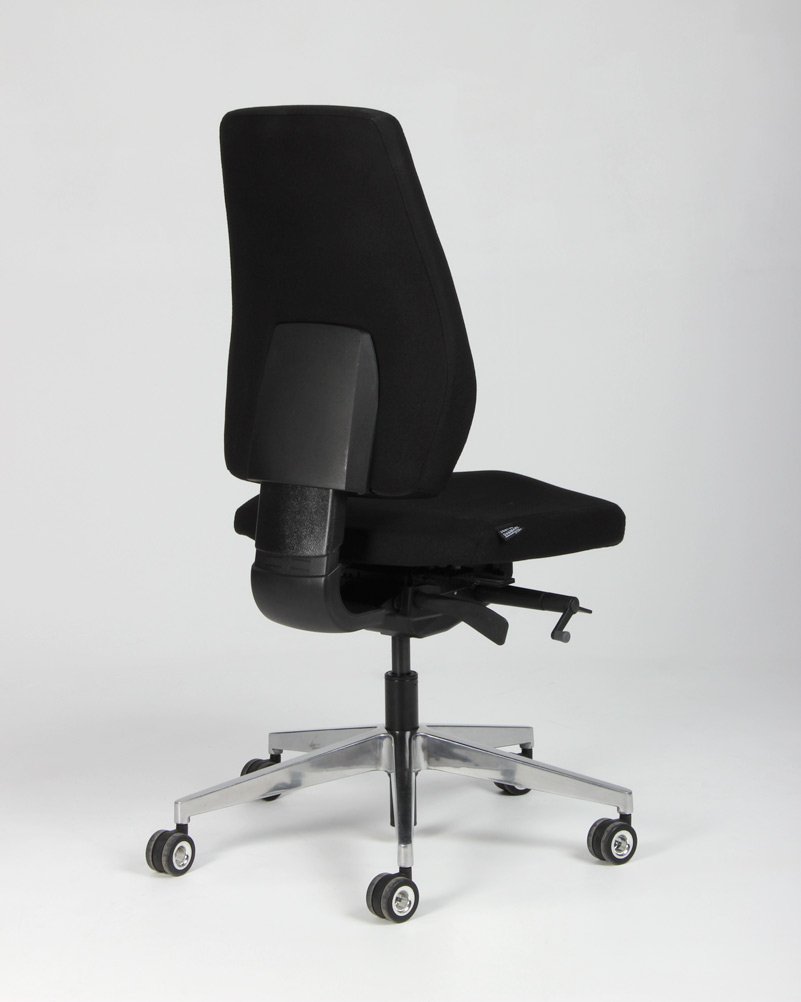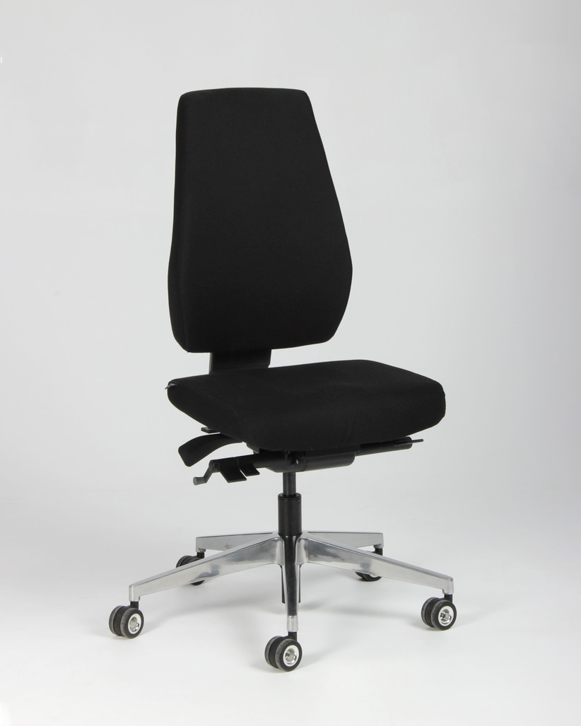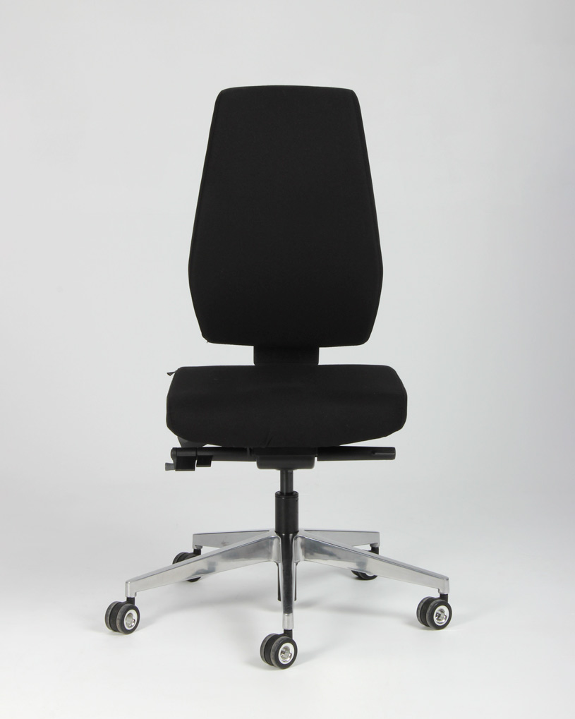 "Ventus kontorstol i sort med poleret fodkryds og gummibanehjul. Stolen tilbyder mange indstillingsmuligheder, der gør det muligt at tilpasse den til de fleste brugere – heriblandt den populære vægtjustering, der ubevist sikrer brugeren en større bevægelsesfrihed.
