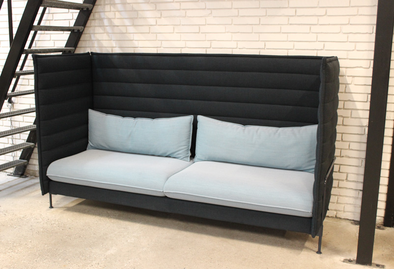 "Vitra Alcove Highback Work sofa med akustikvægge i blå nuancer, med vægge fremstillet i et effektivt lyd- og støjreducerende materiale. Sofaen er perfekt eksempelvis til virksomhedens loungeområde, receptionen eller det åbne kontormiljø, hvor der er behov for diskrete samtaler eller telefonopkald uden omgivelserne forstyrres.