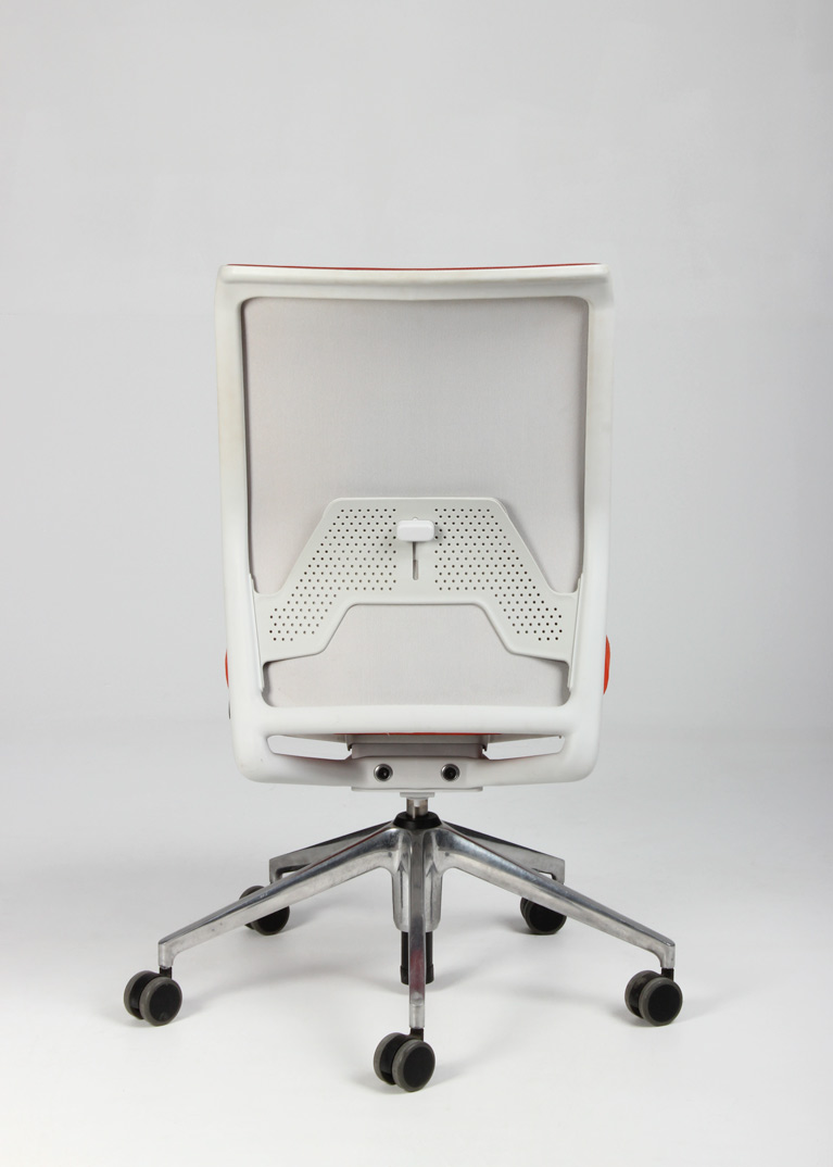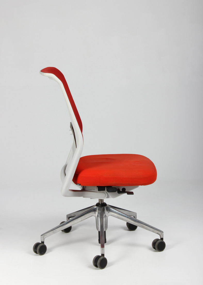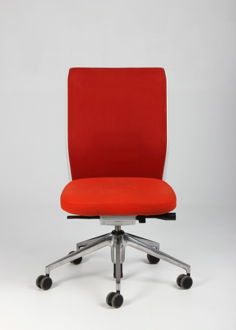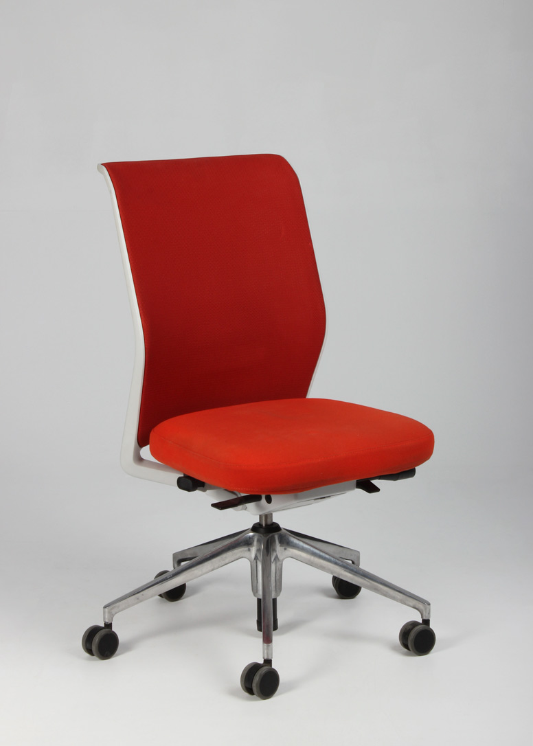 "Vitra ID Mesh kontorstol i rødorange med ryg i den åndbare tesktiltype, mesh. Stolen har udover højdejusterbar gaslift, indstillelig lændestøtte og rygvip, for en optimal siddekomfort.