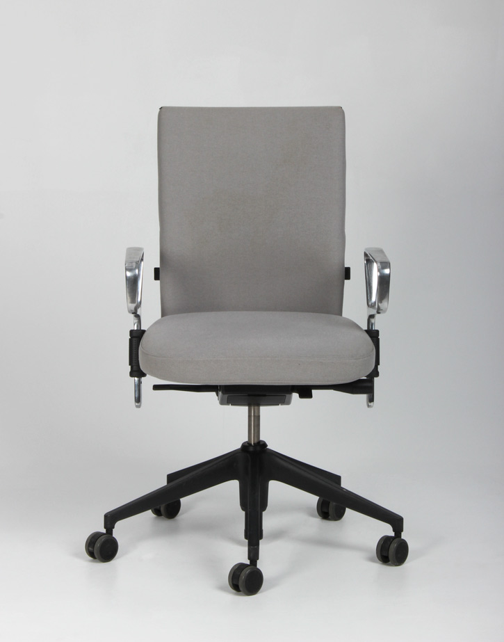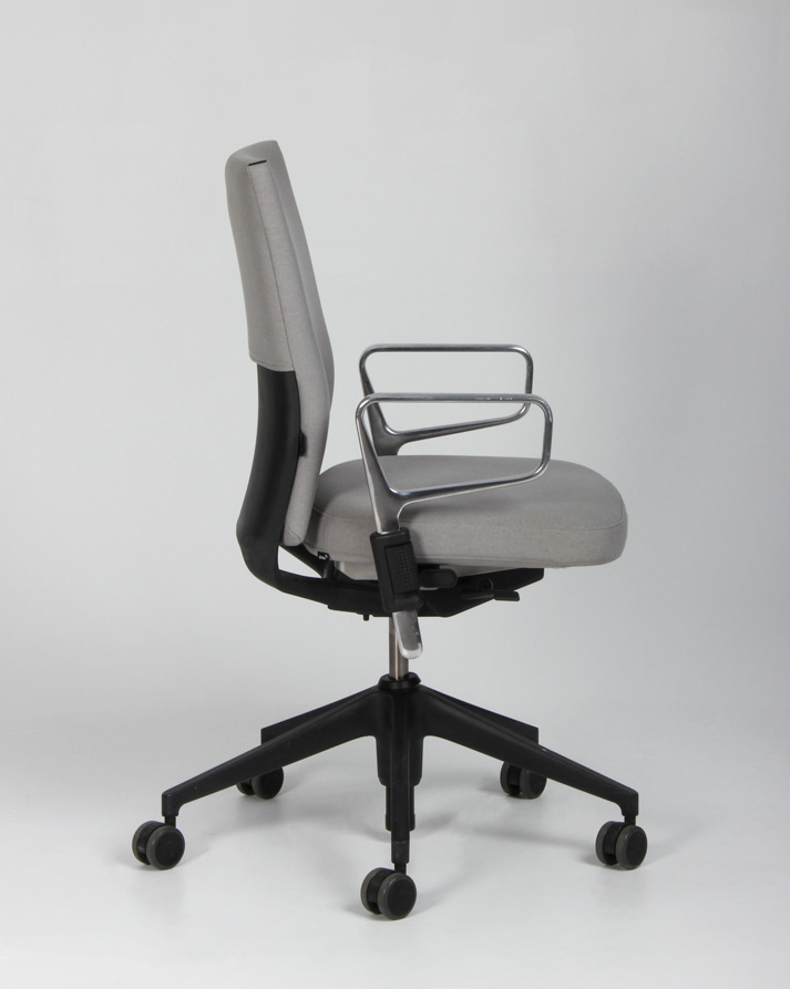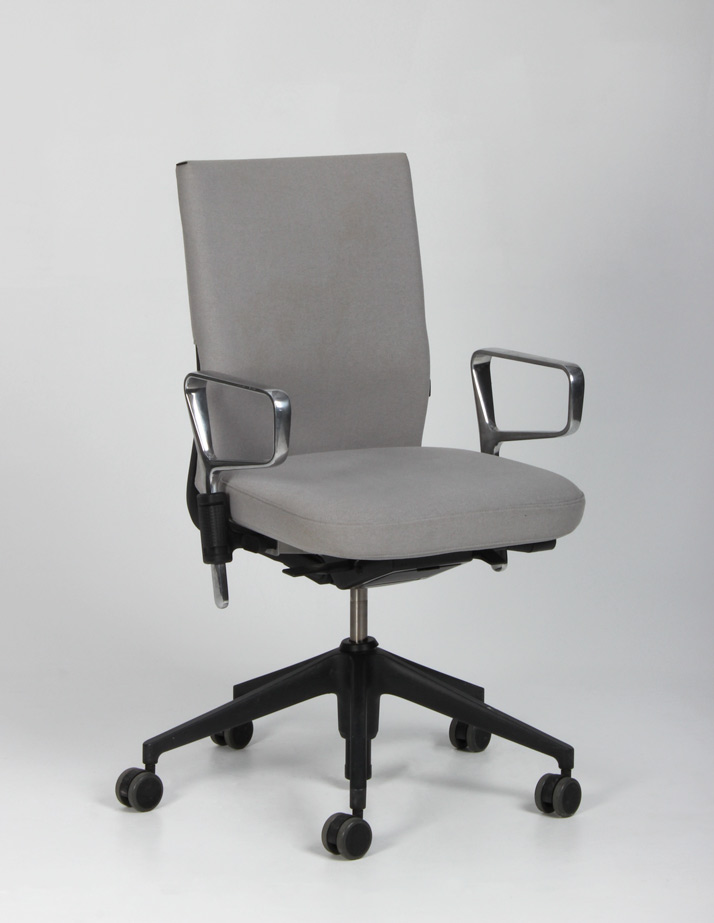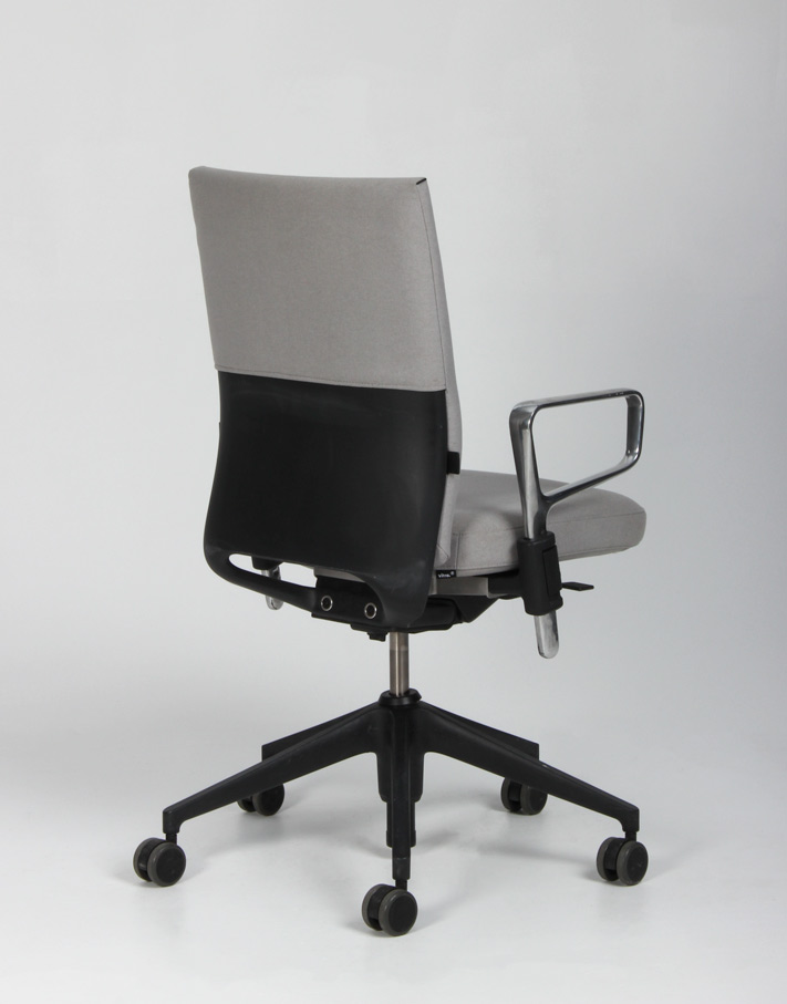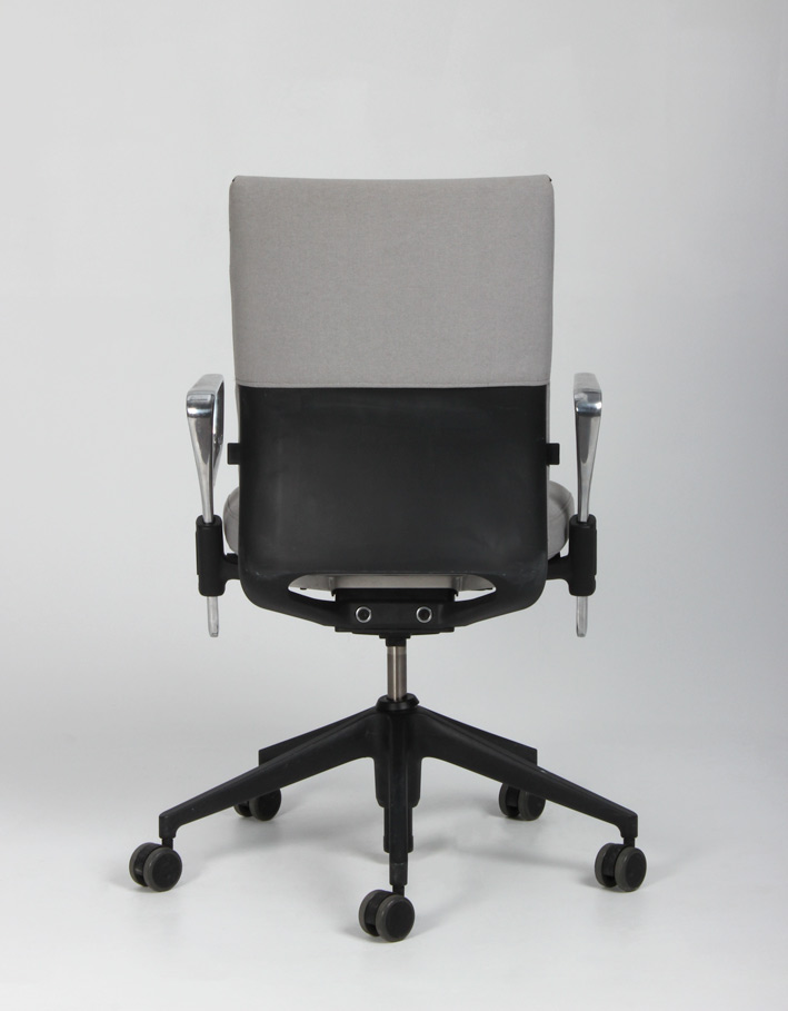 "Vitra kontorstol i gråt vævet remix med armlæn og sort fodkryds. Stolen kan bl.a. kan justeres i sædedybde og elegante højdejustérbare armlæn i poleret stål.