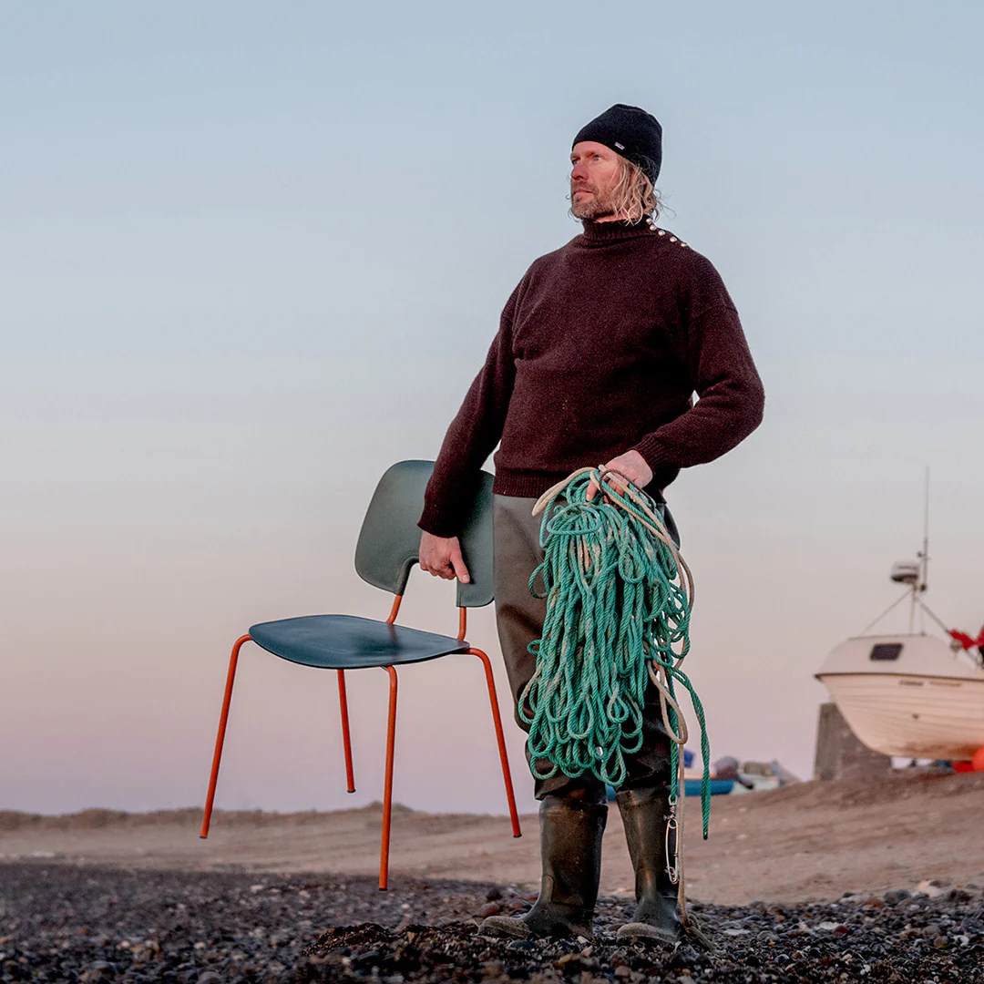 "R.U.M. Original i Fisherman’s Green er en robust og elegant stol, fremstillet af genanvendte fiskenet. Ved at bruge kasserede net som råmateriale bidrager stolen til renere have og en sundere planet. De fleste fiskenet, der anvendes i produktionen, er indsamlet fra danske og færøske farvande og sorteret i hånden i Danmark for at sikre optimal udnyttelse af materialet.