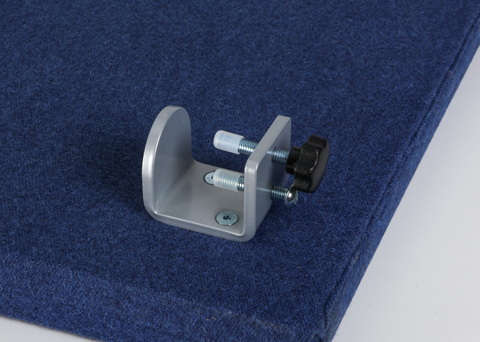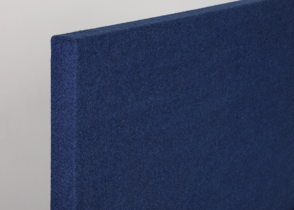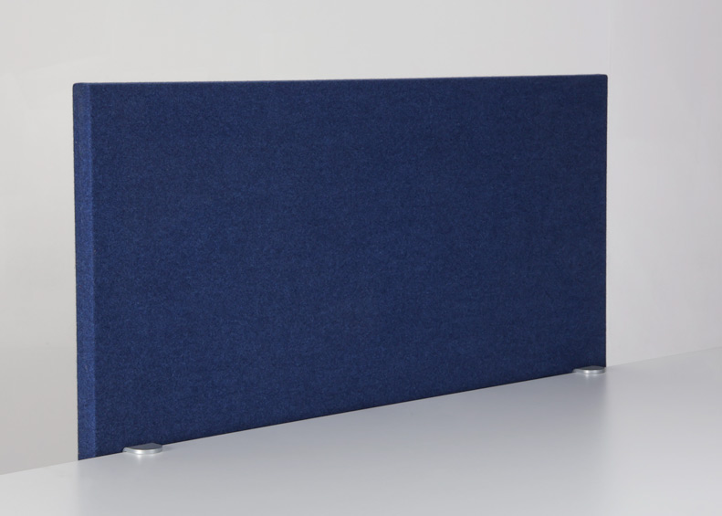 "Zilenzio bordskærm i koboltblå uldfilt, til montering på bordkanten med klemmer. Foruden den primære funktion, at afskærme for uro og høje lyde, er bordskærmen endvidere anvendelig som opslagstavle.
